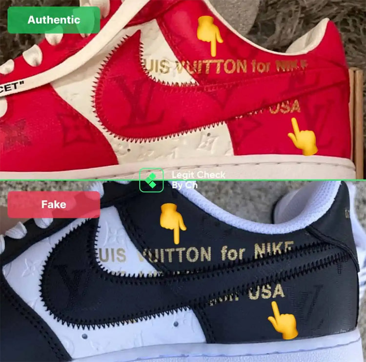 - Giày giả sử dụng phông chữ sai. Chữ trên đôi giày giả rất mỏng và trông hoàn toàn khác so với phông chữ của đôi giày Louis Vuitton AF1 thật.