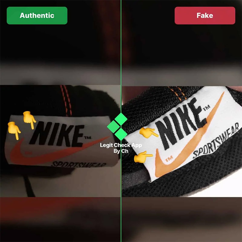 - Thẻ lưỡi gà : Dòng chữ “NIKE” giả có thể sắc nét hơn, với biểu tượng Nike Swoosh ít cong và méo mó hơn.