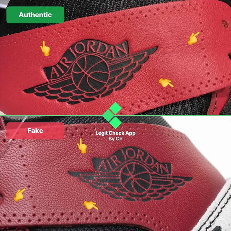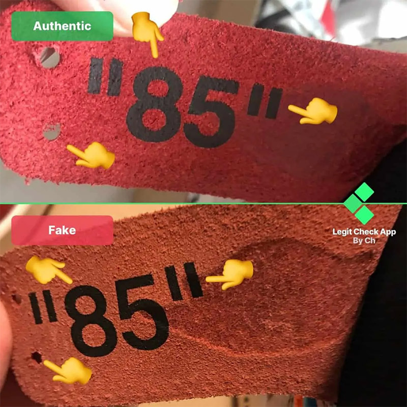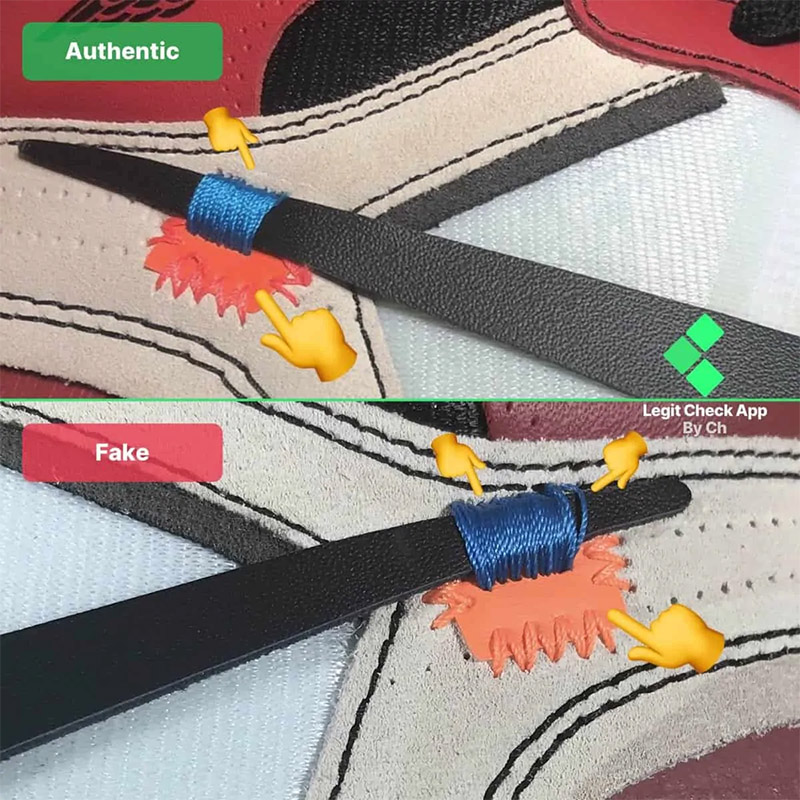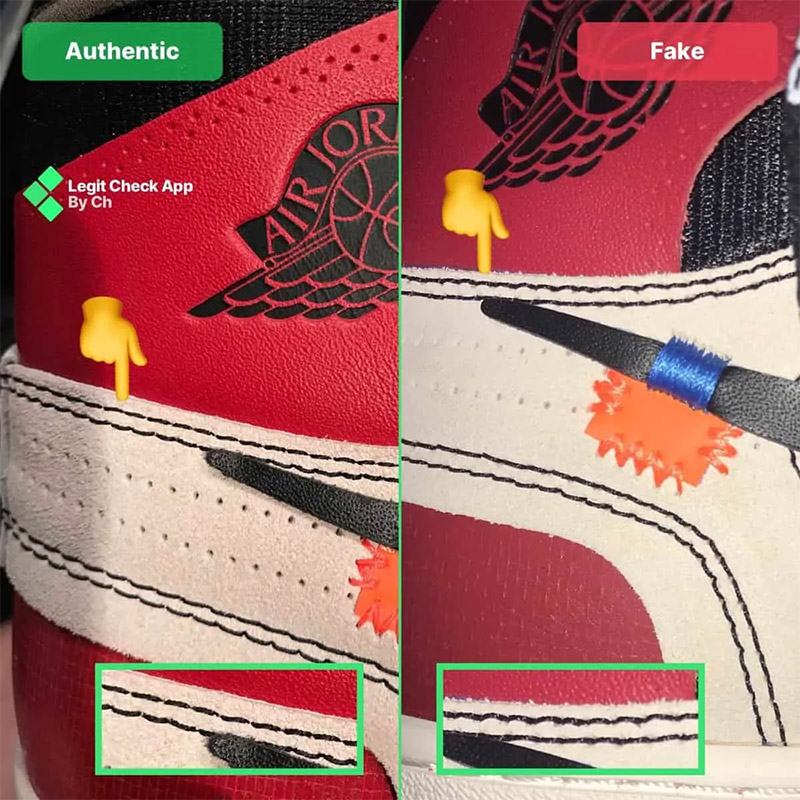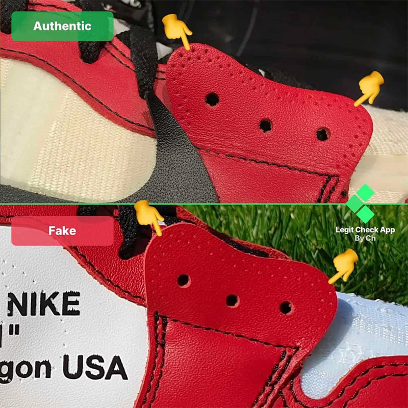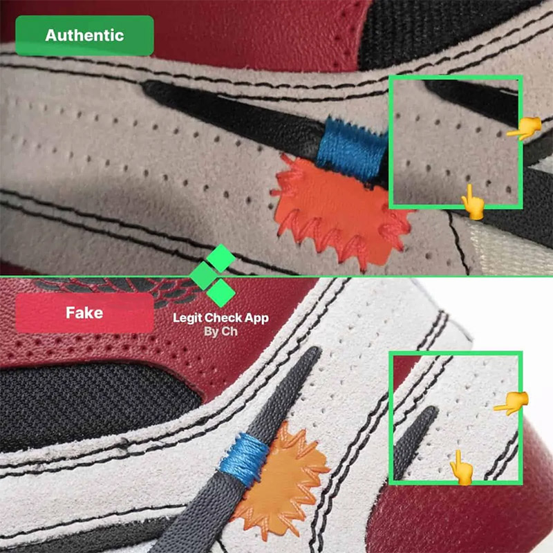 Những lỗ thủng này nằm xung quanh lỗ xỏ dây giày thứ ba trên giày Off-White Air Jordan 1 Chicago. Ở đôi giày giả, mật độ lỗ thực tế nhỏ hơn nhiều so với đôi giày Off-White Chicago chính hãng, có nhiều lỗ hơn xung quanh dây giày.