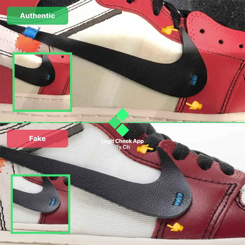 - Khoảng cách giữa phần dưới của biểu tượng Swoosh và đế giày cũng khác nhau trên những đôi Off-White Air Jordan 1 Chicago chính hãng nhưng không quá cao như trên những đôi Off-White Air Jordan 1 OG giả.