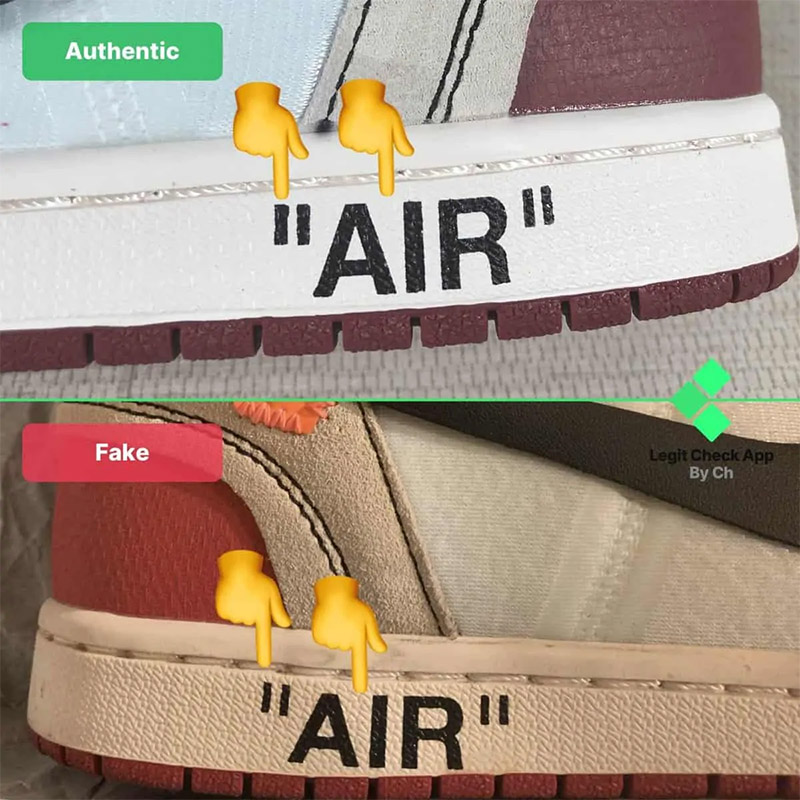 - Hàng Real: Chữ “AIR” được in chính giữa từ trên xuống dưới của đế giữa trên đôi giày Off-White Air Jordan 1 Chicago chính hãng.