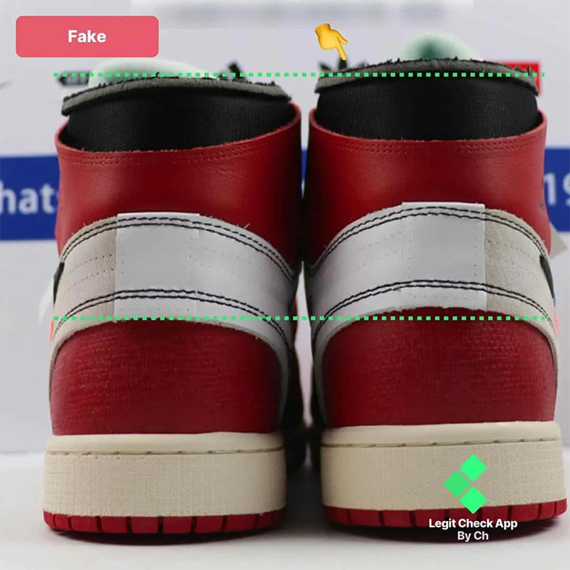 - Chúng tôi sử dụng các chấm màu xanh lá cây để có thể dễ dàng nhìn thấy độ lệch về chiều cao của đôi giày Off-White Air Jordan 1 giả, vì chiếc giày bên trái nhỏ hơn một chút so với chiếc giày bên phải.