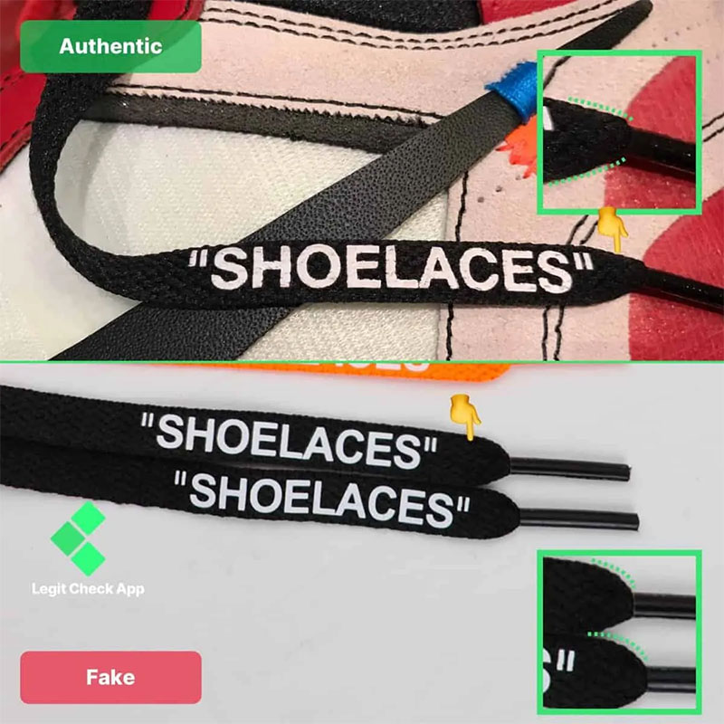 - Trên những đôi giày Off-White Air Jordan 1 Chicago giả, các chữ cái trên dây giày sẽ nằm quá gần nhau. Điều này thể hiện rõ nhất ở vị trí gần giữa chữ “H” và “E” với chữ O trong chữ “SHOE”.