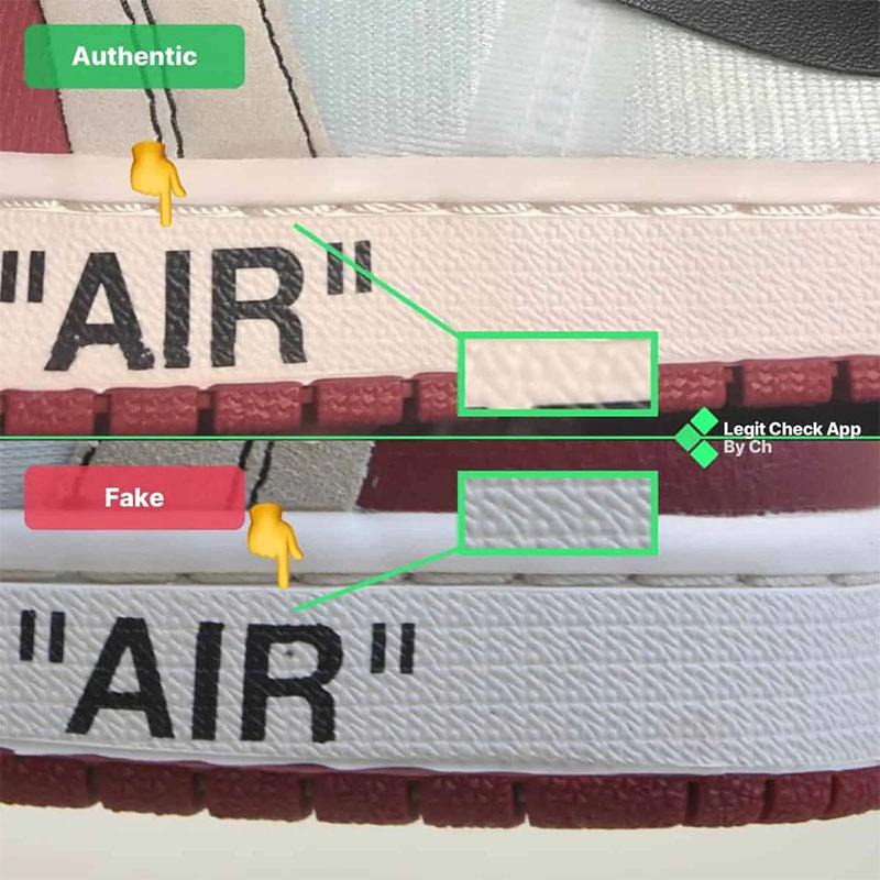 - Họa tiết của vật liệu tìm thấy trên đế giữa màu kem rõ ràng là nổi bật hơn (hoặc đôi khi thậm chí khác biệt) trên đôi giày Off-White Air Jordan 1 Chicago giả.