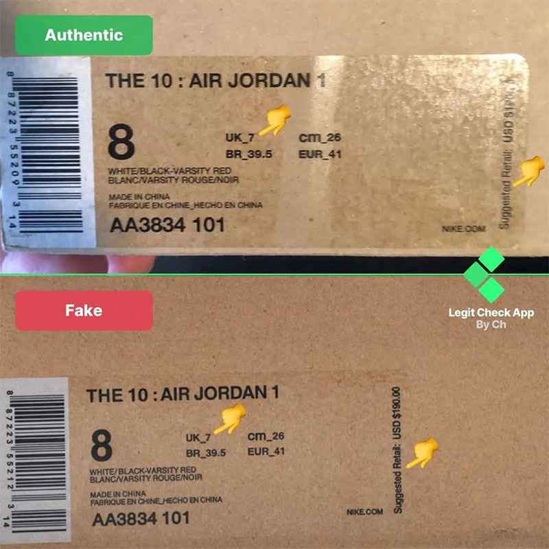 - Ngoài ra, nếu nhãn hộp giày của bạn thiếu dòng chữ “Giá bán lẻ đề xuất: 190,00 USD” ở bên phải giày, đừng lo lắng, điều đó không có nghĩa là đôi giày của bạn là hàng giả, vì một số đôi giày chính hãng cũng không có dòng chữ in đó.