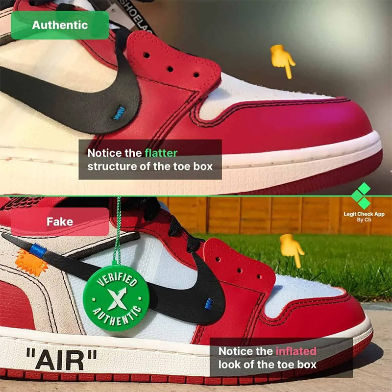 - Giày Jordan 1 Off-White giả sẽ luôn cồng kềnh và to hơn ở phần mũi giày. Nói cách khác, những đôi giày Off-White Jordan 1 Chicago giả được bơm quá mức, nói theo nghĩa bóng thì đây là một lỗi rất dễ thấy.