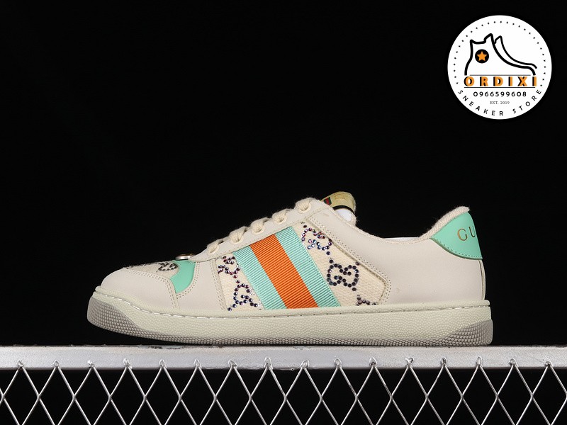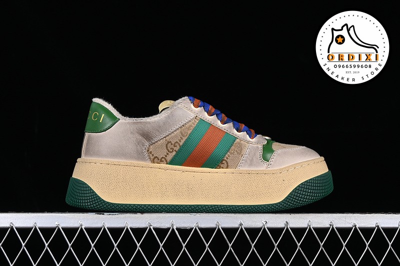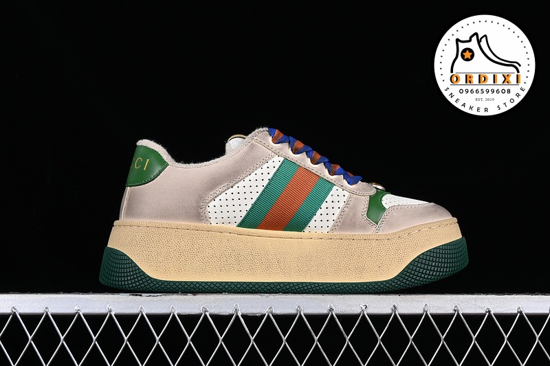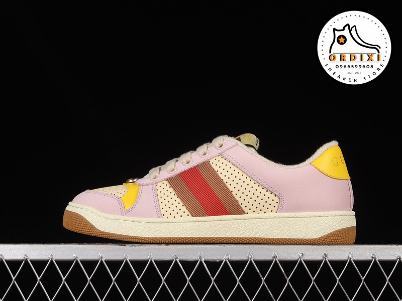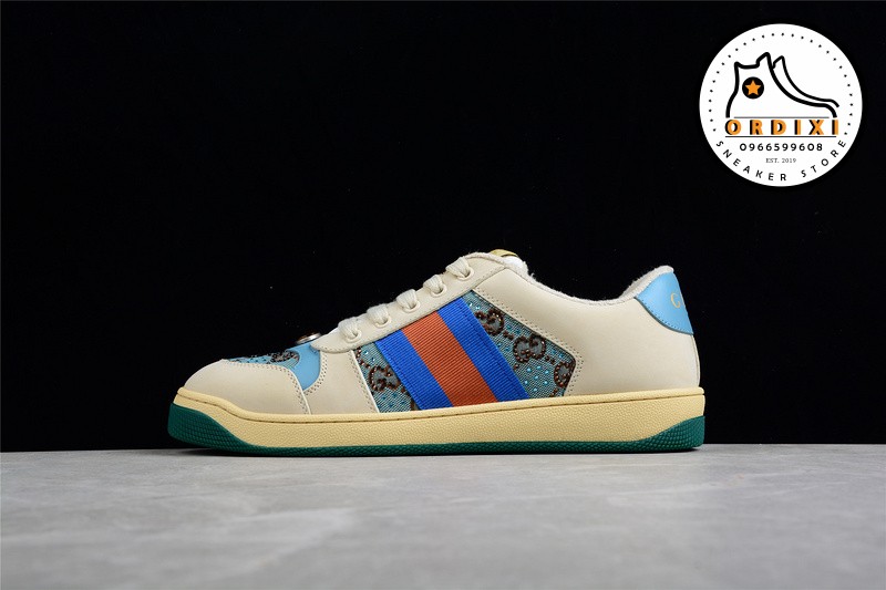 Gucci Distressed Screener Sneaker Beige Purple Red Đôi giày này là sự giao thoa giữa vẻ đẹp cổ điển pha trộn cùng phong cách hiện đại cá tính mang vẻ đặc trưng của thương hiệu Gucci. Tuy mới ra mắt nhưng mẫu giày này đã trở thành doanh thu bán vượt trội của thương hiệu Gucci bởi thiết kế độc đáo ấn tượng.